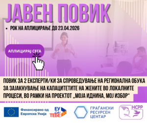 Националниот совет за родова рамноправност објавува јавен повик за ангажирање повик за 2 експерти/ки за спроведување на регионална обука за зајакнување на капацитетите на жените во локалните процеси, во рамки на проектот „Моја иднина, мој избор“